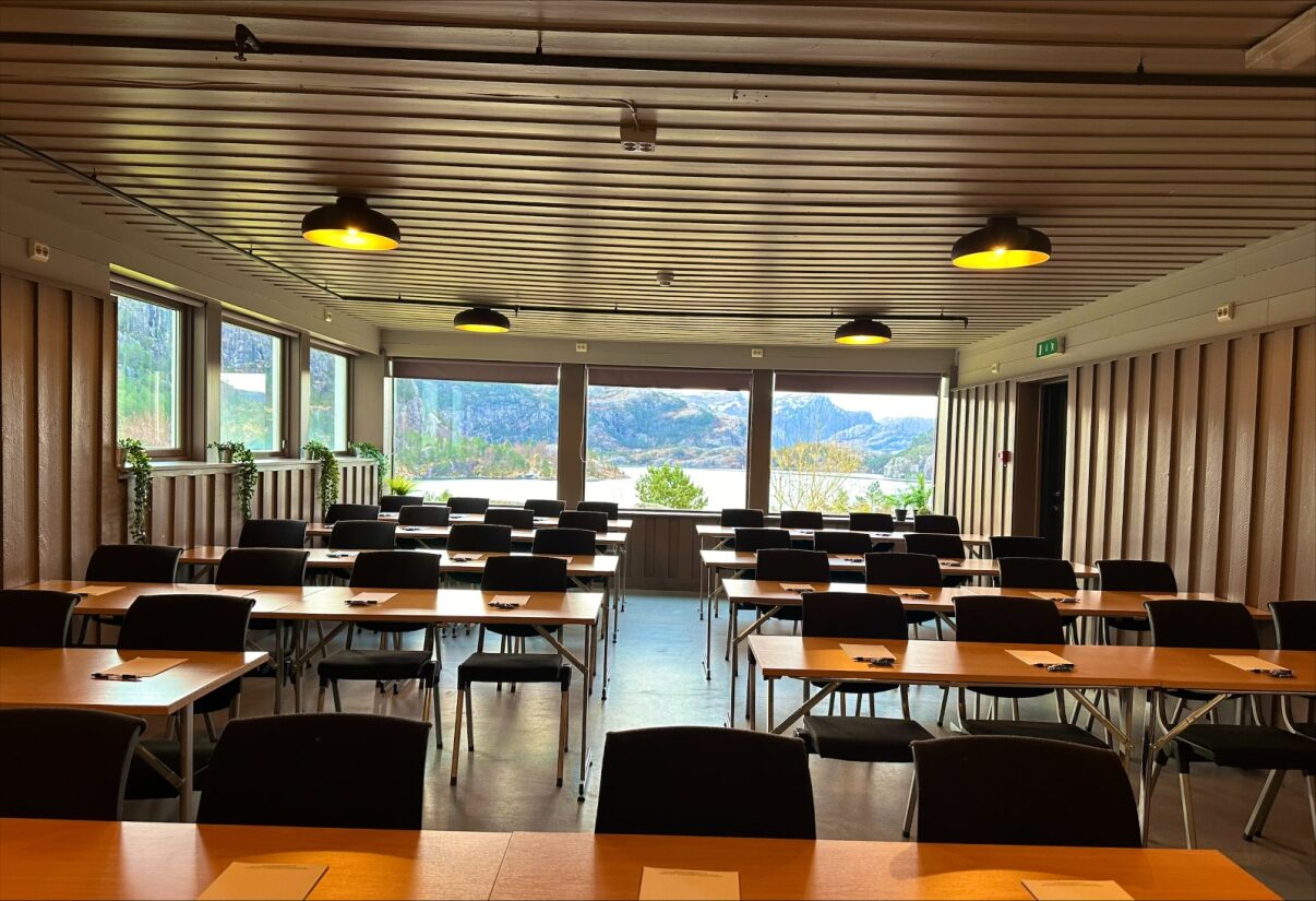 Vårt møterom Refså ligger i kjelleren på den historiske Preikestolhytta som ble bygget i 1949. Refså er vårt største møterom og har plass til opptil 50 personer.